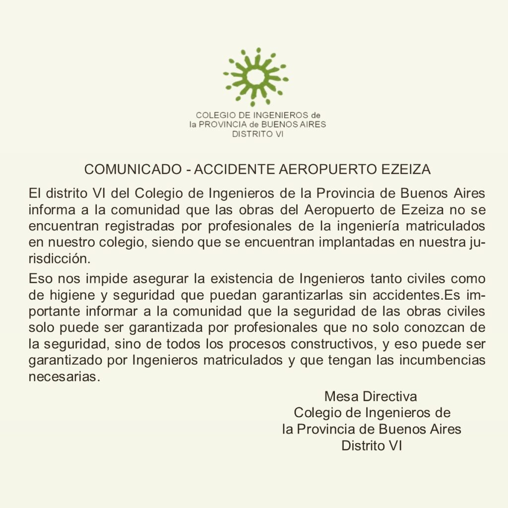…“Nuestro interés institucional es destacar la ausencia del profesional legalmente habilitado – actuando dentro del perfil y alcance de su título- que no esté sometido a sanciones éticas y matriculado en la jurisdicción local “… (Ing. Norberto Beliera Presidente del Colegio de Ingenieros de la Provincia de Buenos Aires, ésta mañana en Mañana Sylvestre Radio 10)