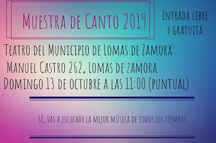 Muestra de Canto 2019 . auspicia CIPBA DTO VICIPBARTE – ciclo de actividades culturales 2019Entrada Libre y Gratuita Tags:CantoCIPBARTETaller de MúsicaTeatro del Municipio